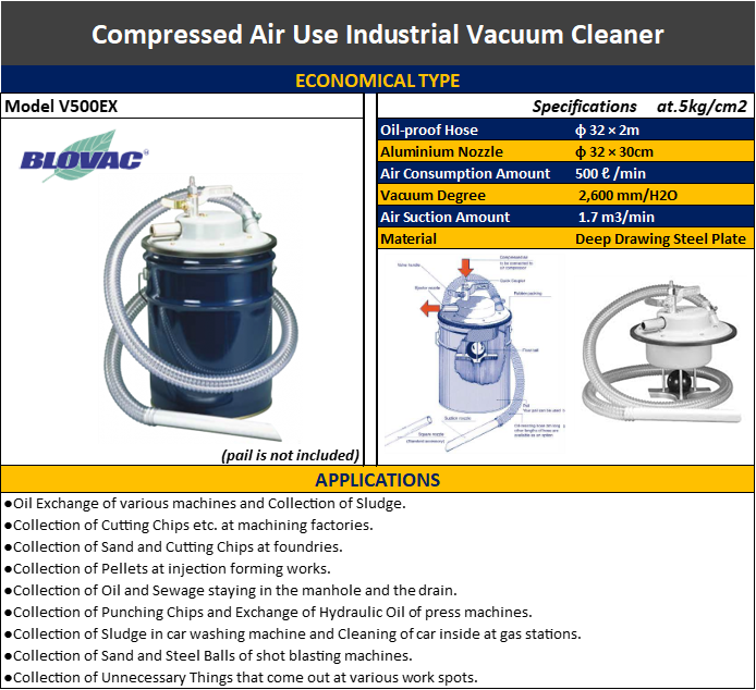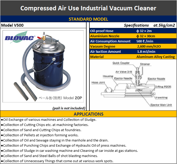 The BLOVAC V500 Vacuum Cleaner is a high performance vacuum cleaner using compressed air for cleaning machine and the surrounding area by collecting chips and necessary dirt that come out at various work spots in the factories and can be used for both solid and liquid dirt such as water, oil, cutting chips, pellets, and dusts.