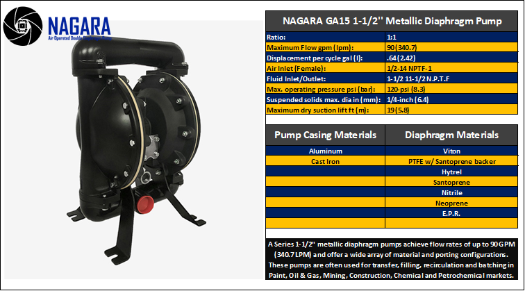 Series 1-1/2" metallic (Aluminium & Cast Iron) diaphragm pumps achieve flow rates up to 90 GPM (340.7 LPM) and offer various material and porting configurations. These pumps are ideal for transfer, filling, recirculation, and batching in Paint, Oil & Gas, Mining, Construction, Chemical, and Petrochemical markets.