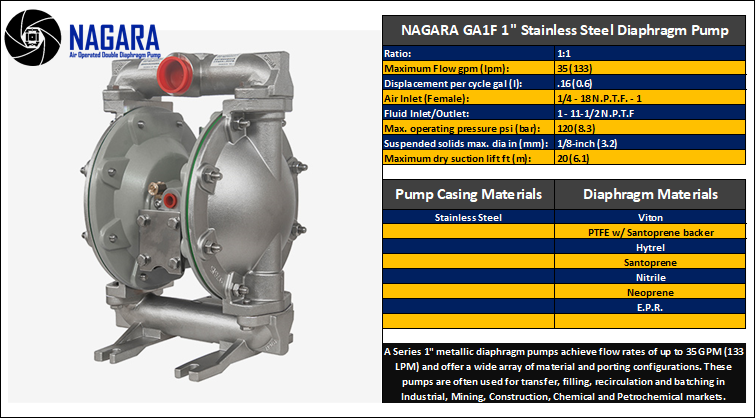 Series 1" metallic (Stainless Steel) diaphragm pumps achieve flow rates up to 35 GPM (133 LPM) and offer various material and porting configurations. These pumps are commonly used for transfer, filling, recirculation, and batching in Industrial, Mining, Construction, Chemical, and Petrochemical markets.