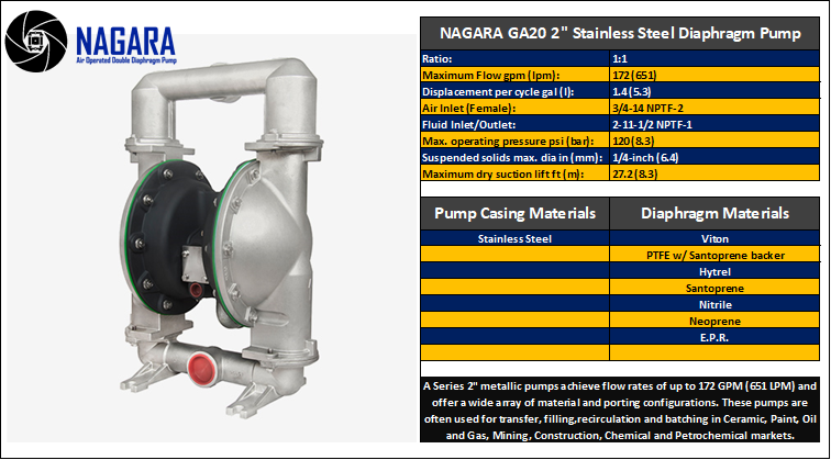 Air-Operated Design: Nagara AODD pumps are powered by compressed air, making them suitable for use in environments where electrical pumps may be hazardous. This feature also allows for easy operation and control of flow rates.