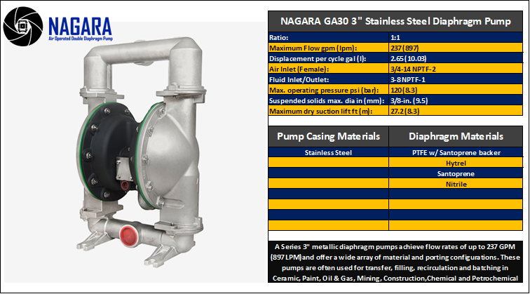 Series 3" metallic (Stainless Steel) diaphragm pumps achieve flow rates up to 237 GPM (897 LPM) and offer various material and porting configurations. Ideal for transfer, filling, recirculation, and batching in Ceramic, Paint, Oil & Gas, Mining, Construction, Chemical, and Petrochemical industries.